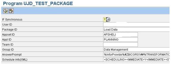 接下来,进入TCode:SE38->UJD_TEST_PACKAGE,填入一系列需要的参数,Team ID大多数时候是为空,Schedule Info不用修改,answerPrompt选取本地做好的answerprompt文件,程序会自动读取内容。不要直接把内容复制到这个文本框中,因为程序会做一些特殊字符的替换。第一个参数If Synchronous,是用来提示程序,执行数据包的操作不是通过schedule的方式从BW新建job的方式来运行的,而是直接通过程序执行的。这样的执行方法,是我们可以debug代码的第一种方法。