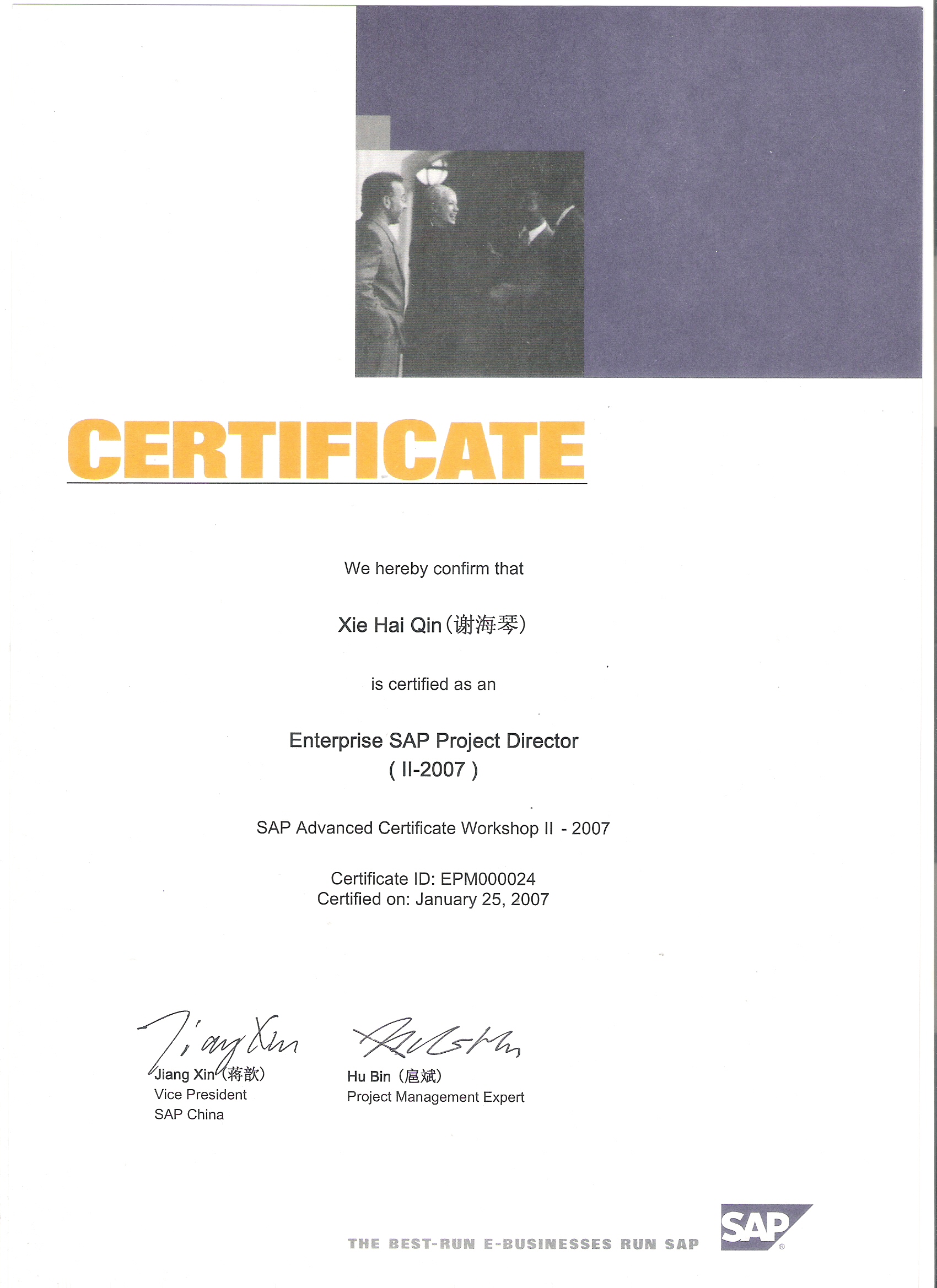以上照片是第二届SAP项目经理和项目总监认证的高级研修班,证书签署者同样是SAP中国高级副总裁蒋歆先生和优胜之道高级咨询总监扈斌先生。