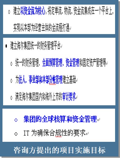 海尔集团SAP项目是SAP中国最早实施的一批行业灯塔项目之一,为了实现集团全球SAP项目实施,聘请惠普公司实施“SAP全球模板”项目,然后推广至SAP全球的公司。但是,海尔信息化领导面临众多“企业ERP需求在SAP系统中无法实现”、“咨询公司承诺的ERP目标与SAP模块不一致”等现象,所以急需公正的SAP专业公司做第三方监理,并公开招标。