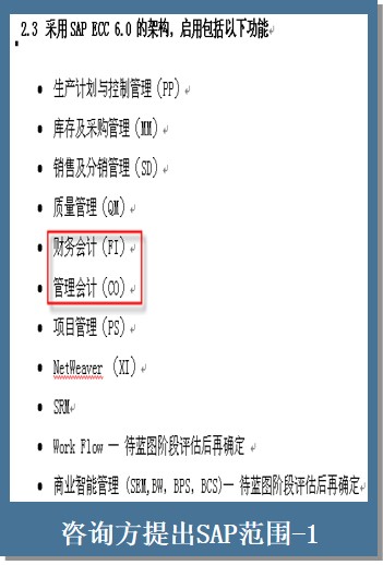 优胜之道为海尔集团的信息化建设保驾护航,杜绝了不少咨询方的咨询黑洞,例如,咨询方提出的项目目标与具体SAP实施范围完全不一致,前者是给海尔领导看的、为了”骗取“较高的咨询费合同,后者是给海尔业务部门看的、尽量减少实施范围,具体情况见下图:实施目标提出了“全面预算管理、资金管理“,却在SAP具体实施范围中没有任何体现。
